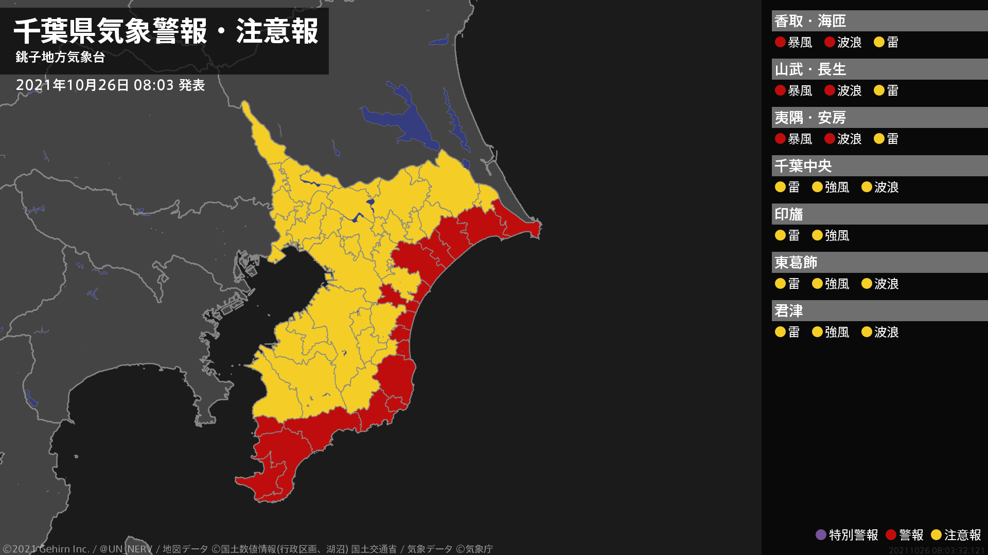 【千葉県 気象警報・注意報 2021年10月26日 08:03】北東部、南部の海上では、26日昼前まで暴風に警戒してください。北東部、南部では、26日昼前まで高波に警戒してください。#気象警報注意報 #千葉県