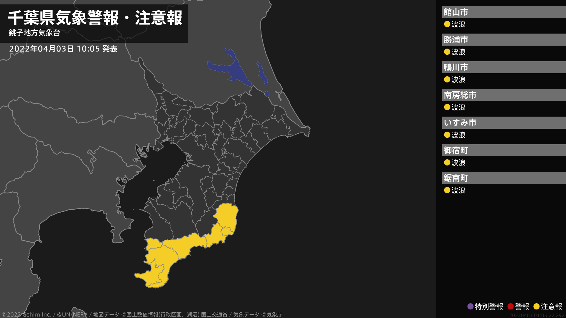 【千葉県 気象警報・注意報 2022年04月03日 16:04】北東部、南部では、高波に注意してください。#気象警報注意報 #千葉県