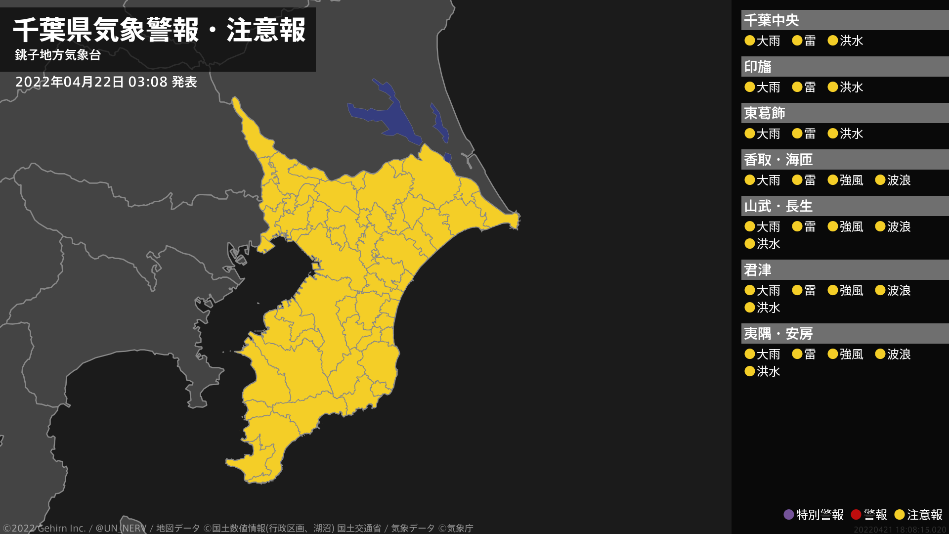 【千葉県 気象警報・注意報 2022年04月22日 03:08】北東部、南部では、土砂災害や強風、高波に注意してください。千葉県では、低い土地の浸水や河川の増水、竜巻などの激しい突風、落雷に注意してください。#気象警報注意報 #千葉県