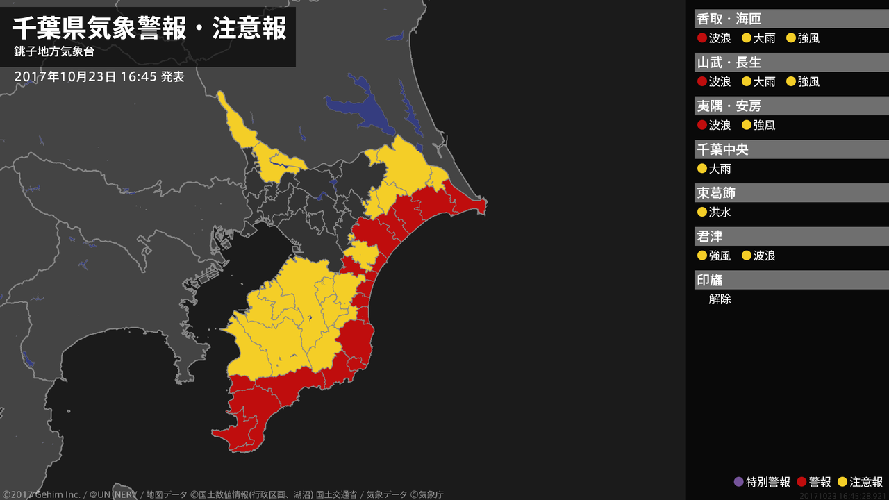 【千葉県 気象警報 2017年10月23日 16:45】