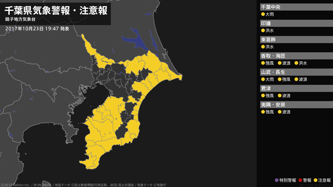 【千葉県 気象警報・注意報 2017年10月23日 19:47】