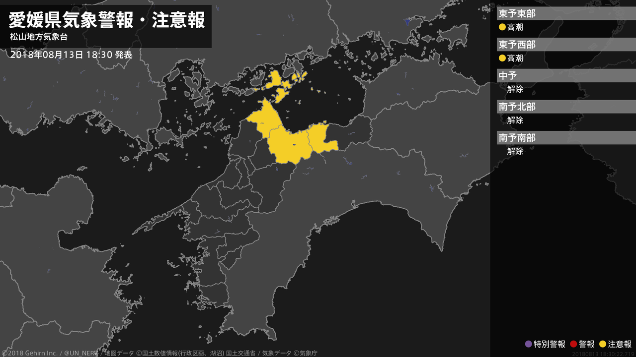 【愛媛県 気象警報・注意報 2018年08月13日 18:30】