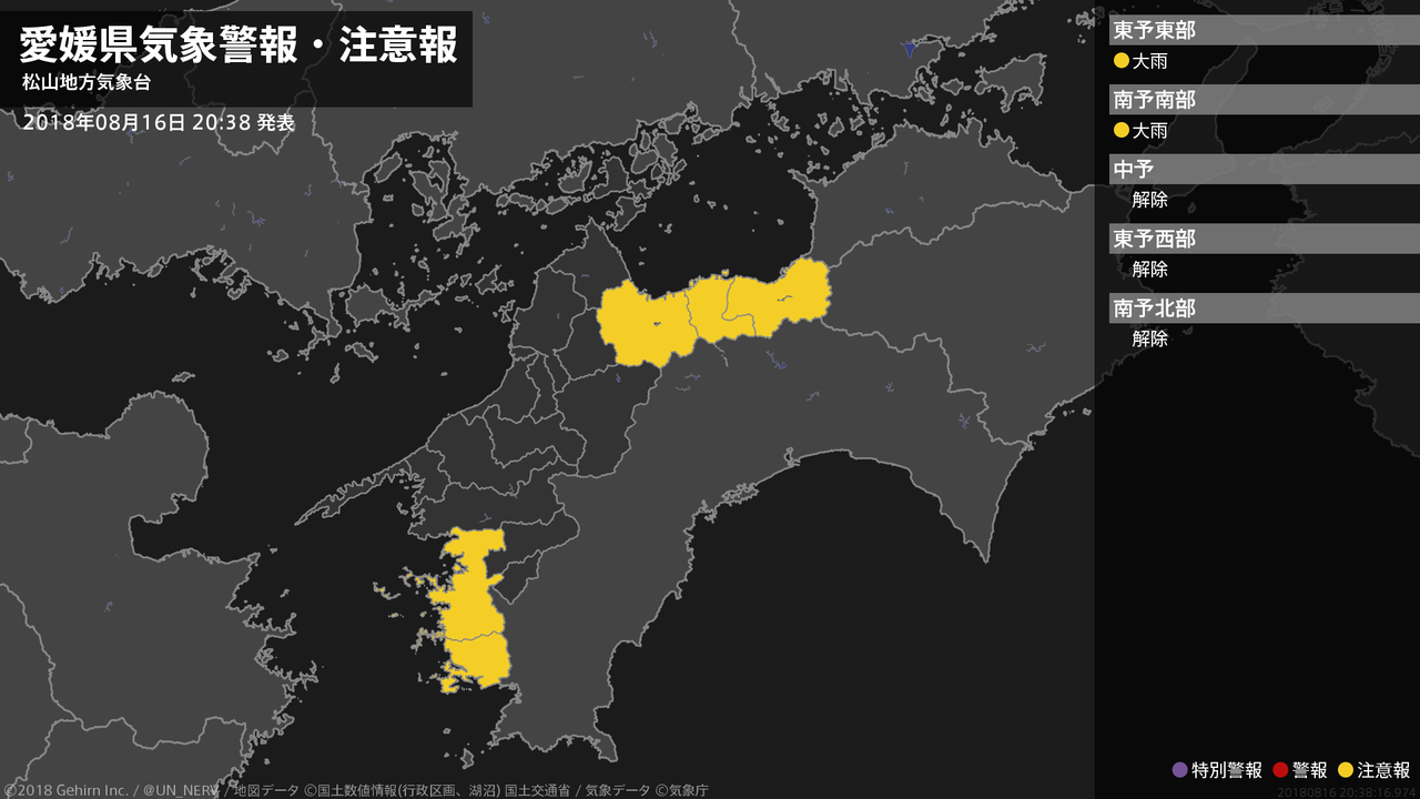 【愛媛県 気象警報・注意報 2018年08月16日 20:38】東予、南予では、16日夜遅くまで土砂災害に注意してください。#気象警報注意報 #愛媛県