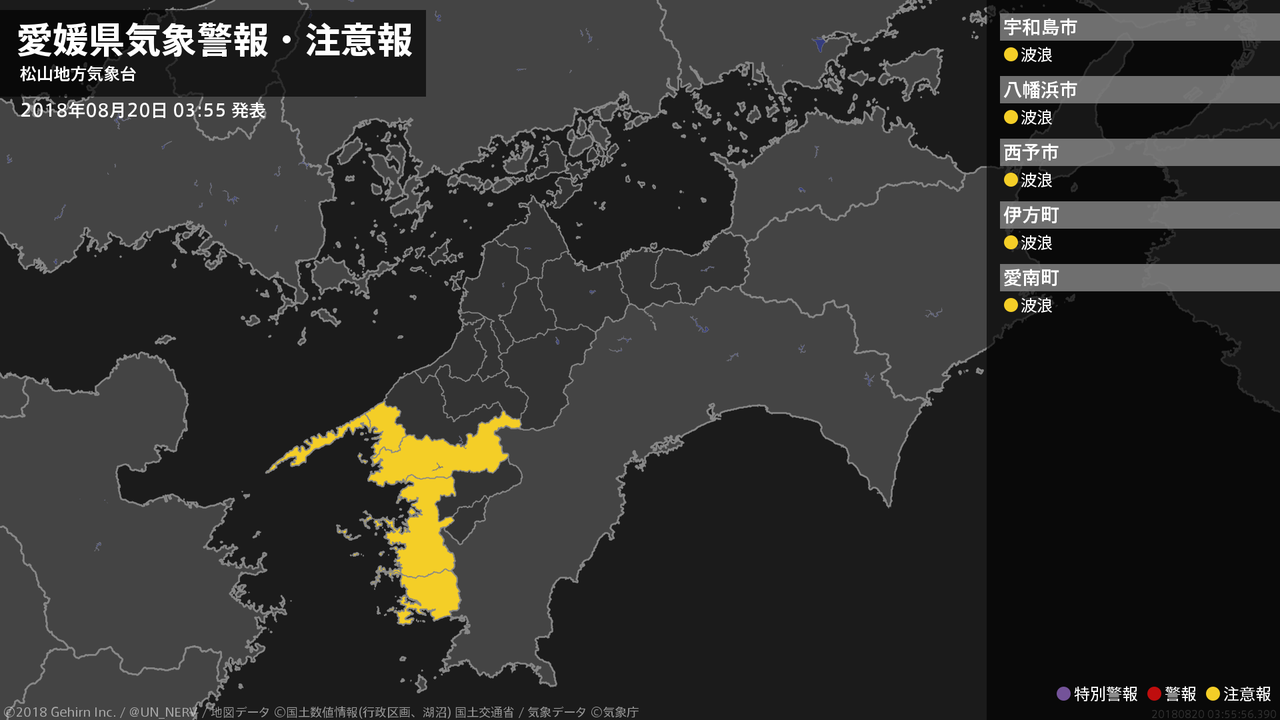 【愛媛県 気象警報・注意報 2018年08月20日 03:55】南予では、高波に注意してください。#気象警報注意報 #愛媛県