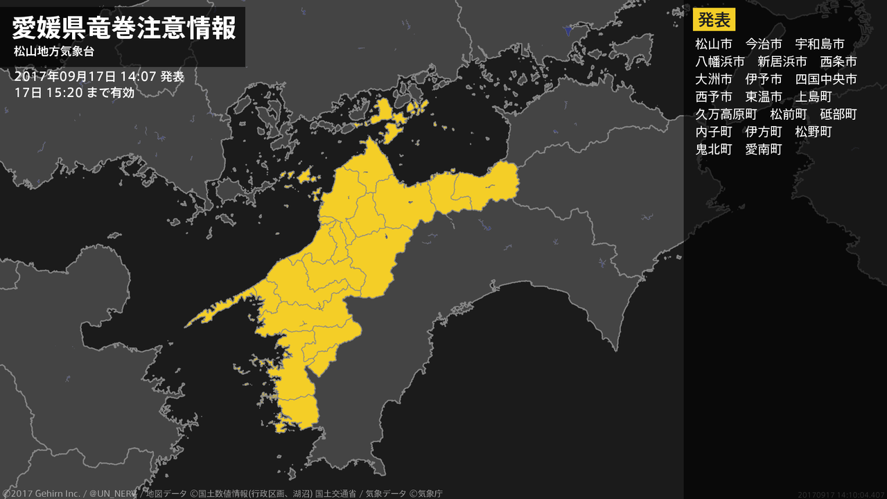 【愛媛県 竜巻注意情報】愛媛県は、竜巻などの激しい突風が発生しやすい気象状況になっています。頑丈な建物内に移動するなど安全確保に努めてください。この情報は17日14:20まで有効です。#竜巻注意情報 #愛媛県