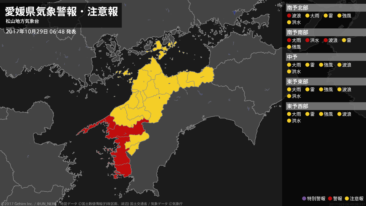 【愛媛県 気象警報 2017年10月29日 06:49】南予では、29日昼前まで土砂災害や河川の増水に、29日昼前から29日昼過ぎまで高波に警戒してください。#気象警報 #気象警報注意報 #愛媛県