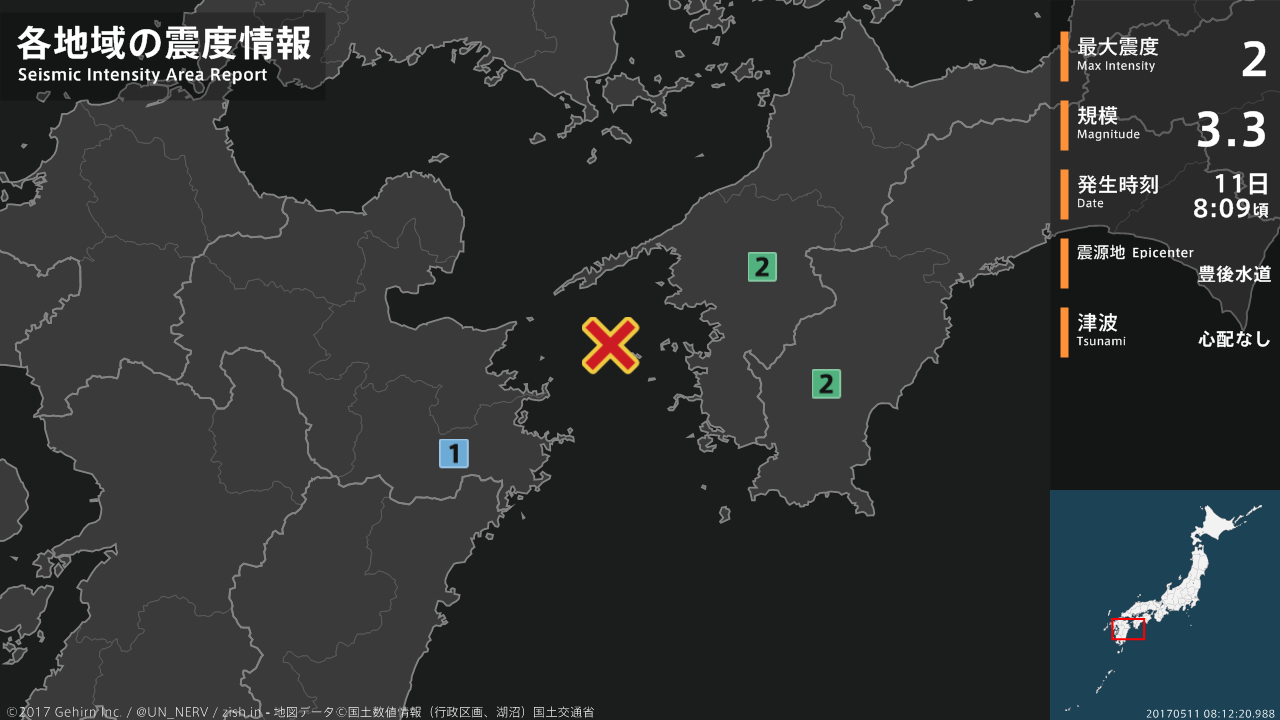 08時09分頃、豊後水道を震源とする地震がありました。震源の深さは約40km、地震の規模はM3.3、最大震度2を愛媛県、高知県で観測しています。この地震による津波の心配はありません。