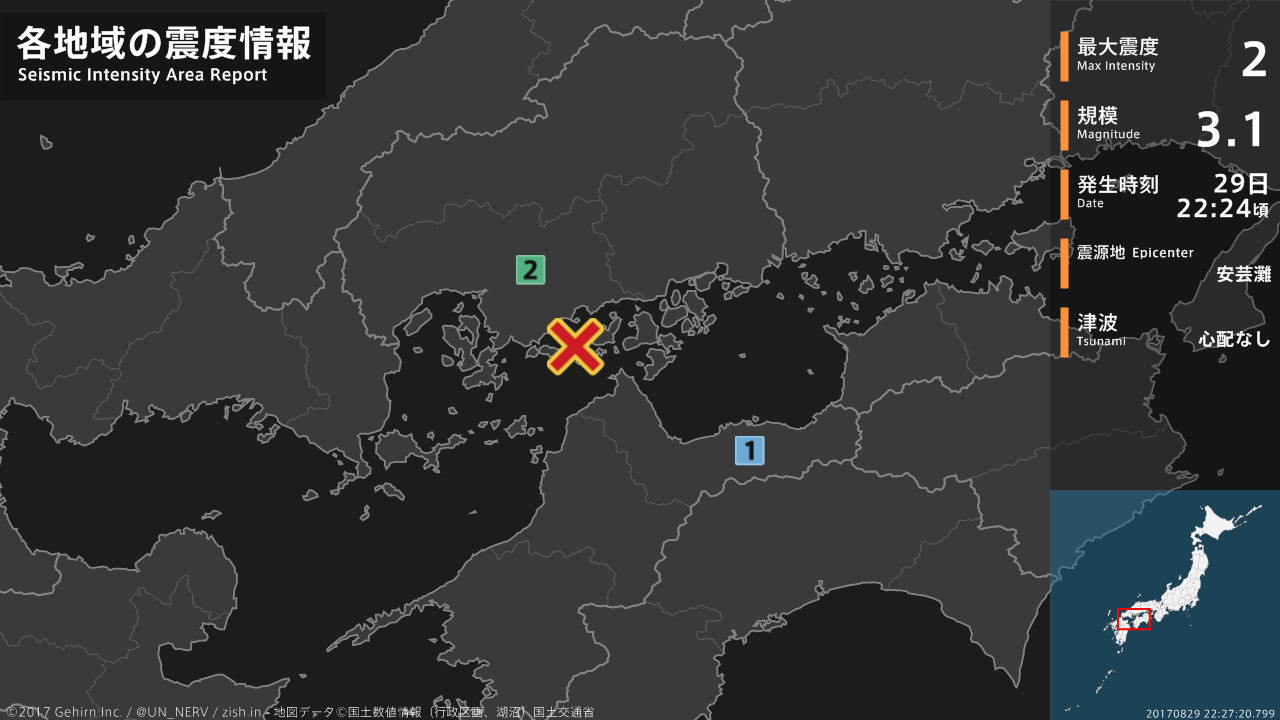【地震情報 2017年8月29日】22時24分頃、安芸灘を震源とする地震がありました。震源の深さは約20km、地震の規模はM3.1、最大震度2を広島県で観測しています。この地震による津波の心配はありません。#地震 #広島県 #愛媛県