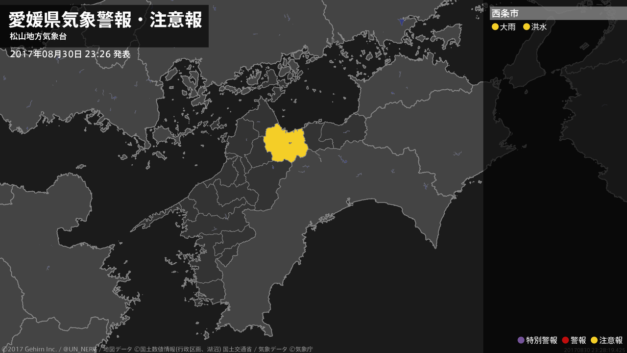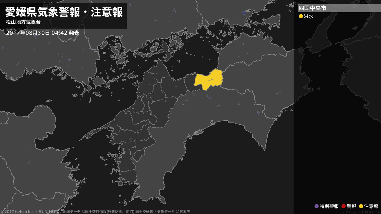 【愛媛県 気象警報・注意報 2017年08月30日 04:44】東予では、30日朝まで河川の増水に注意してください。#気象警報注意報 #愛媛県