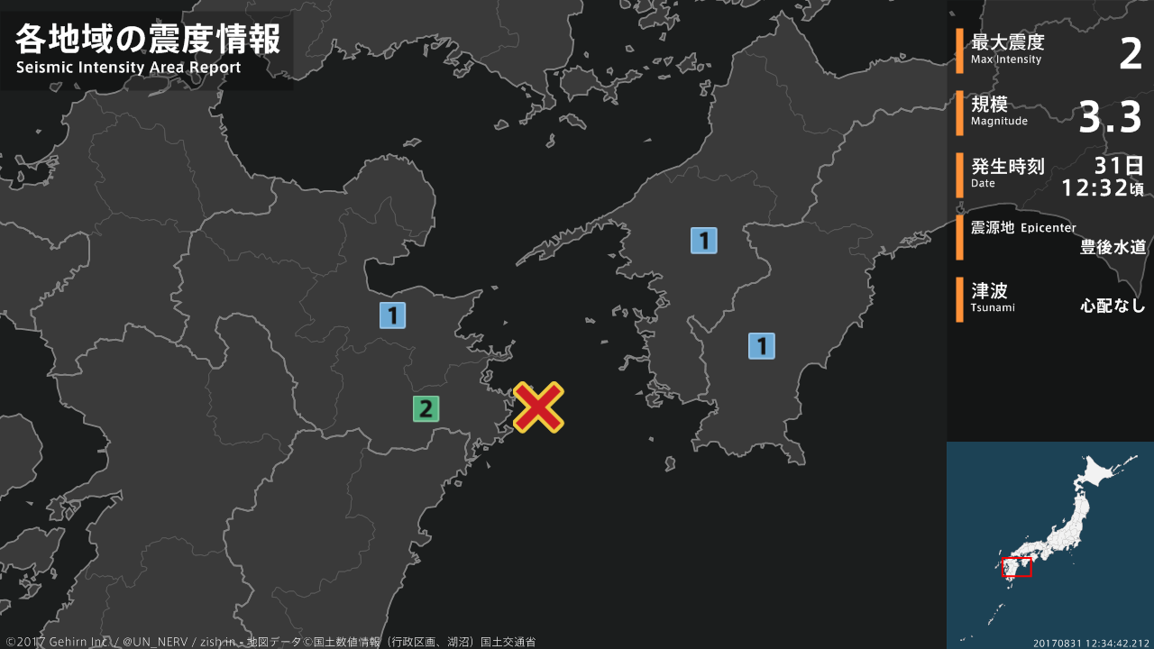 【地震情報 2017年8月31日】12時32分頃、豊後水道を震源とする地震がありました。震源の深さは約40km、地震の規模はM3.3、最大震度2を大分県で観測しています。この地震による津波の心配はありません。#地震 #大分県 #愛媛県 #高知県