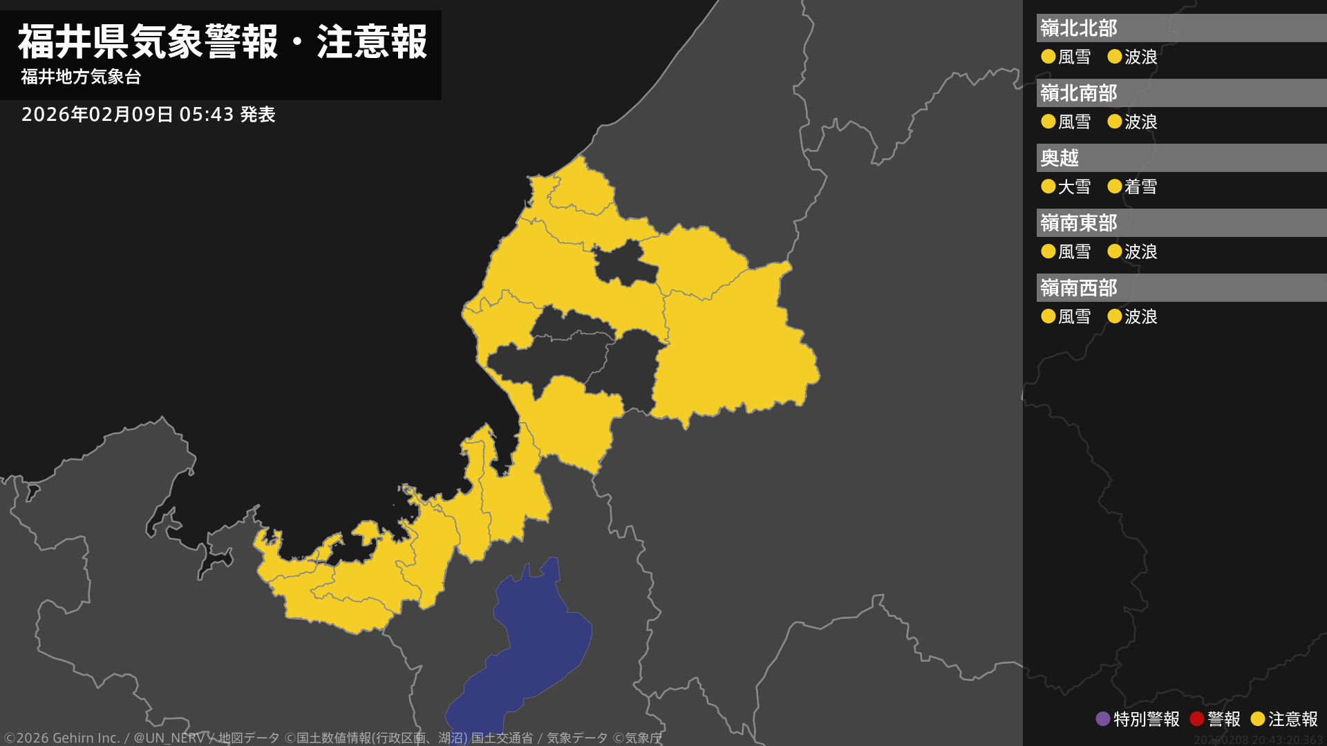 【福井県 気象警報・注意報 2026年02月09日 05:43】