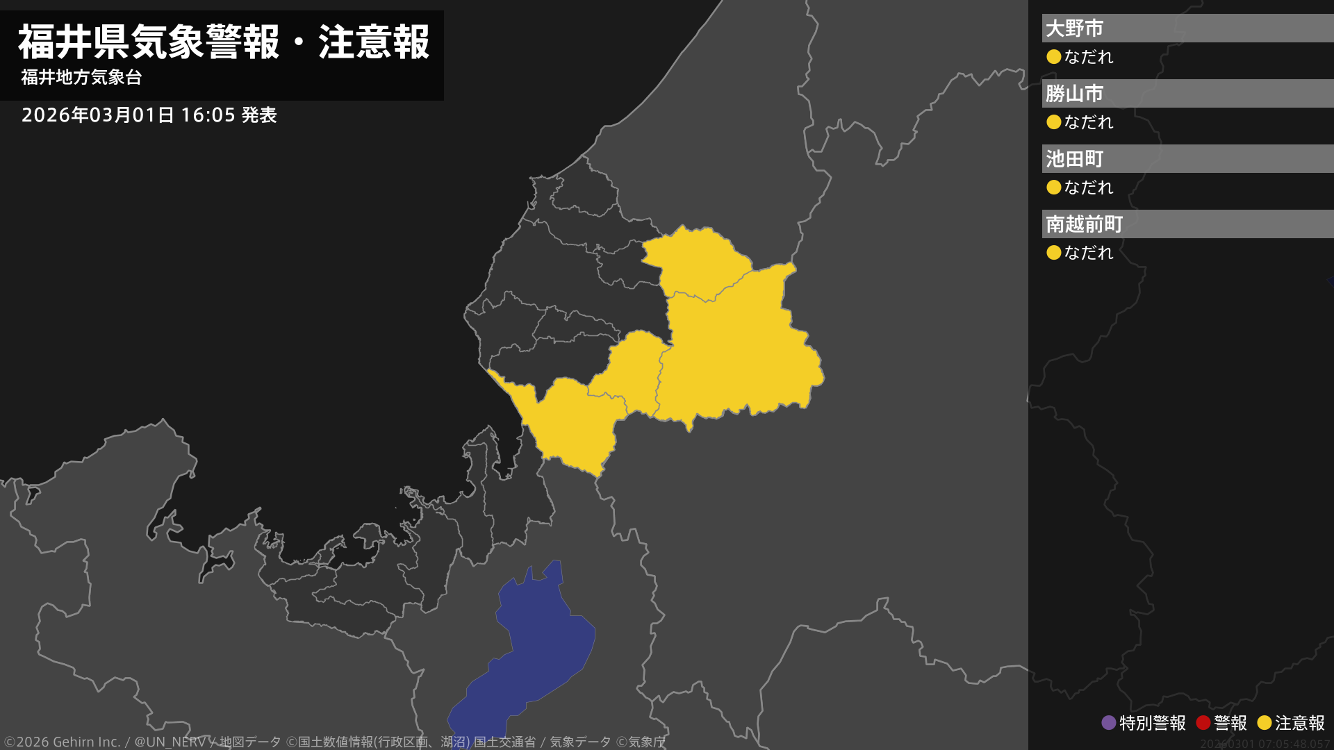 【福井県 気象警報・注意報 2026年03月01日 16:05】