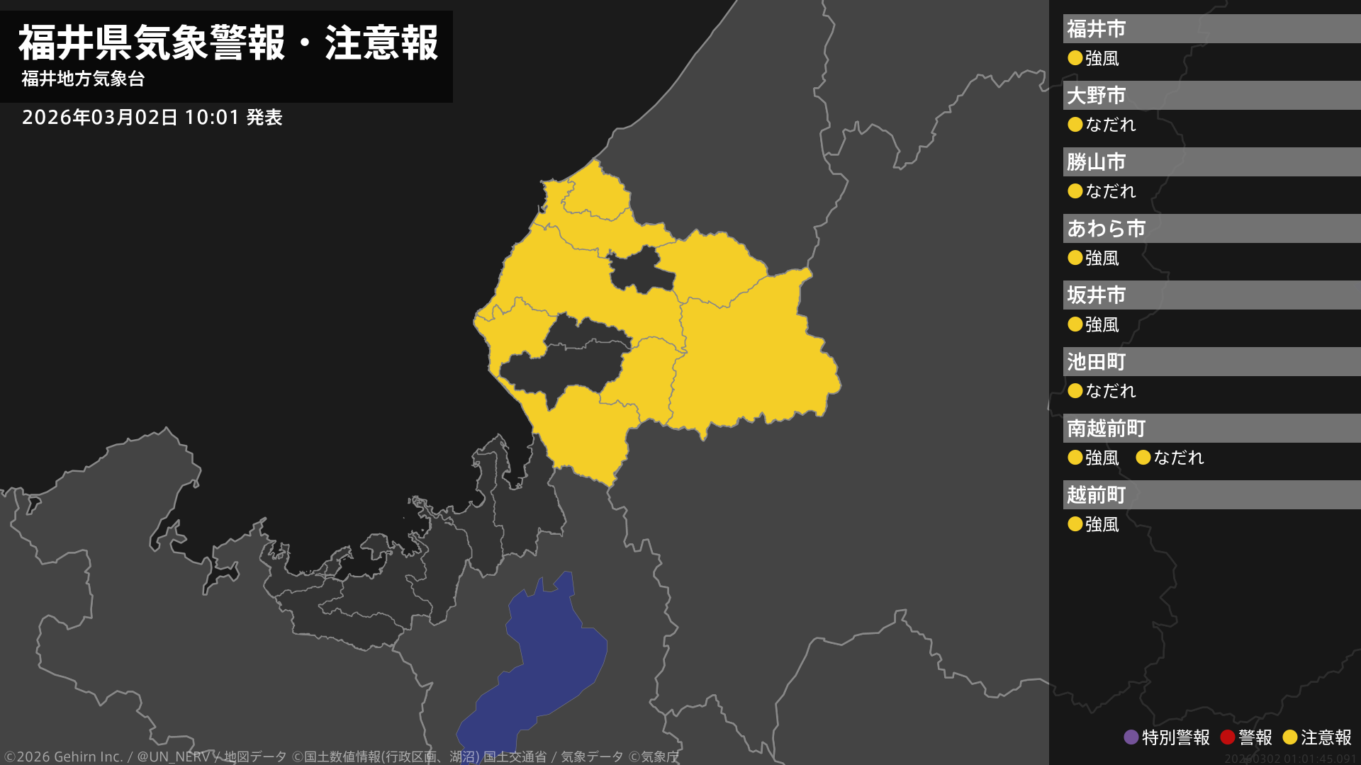 【福井県 気象警報・注意報 2026年03月02日 10:01】