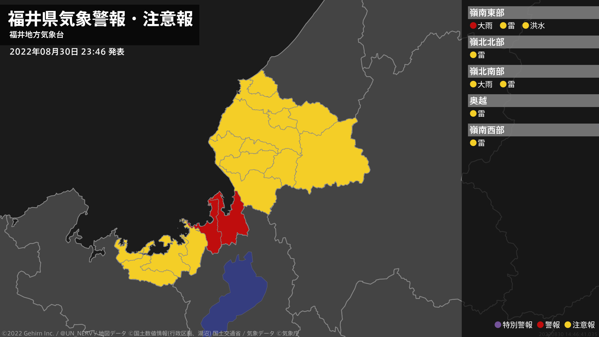【福井県 気象警報・注意報 2022年08月30日 23:46】嶺南では、31日未明まで土砂災害や低い土地の浸水に警戒してください。#気象警報注意報 #福井県