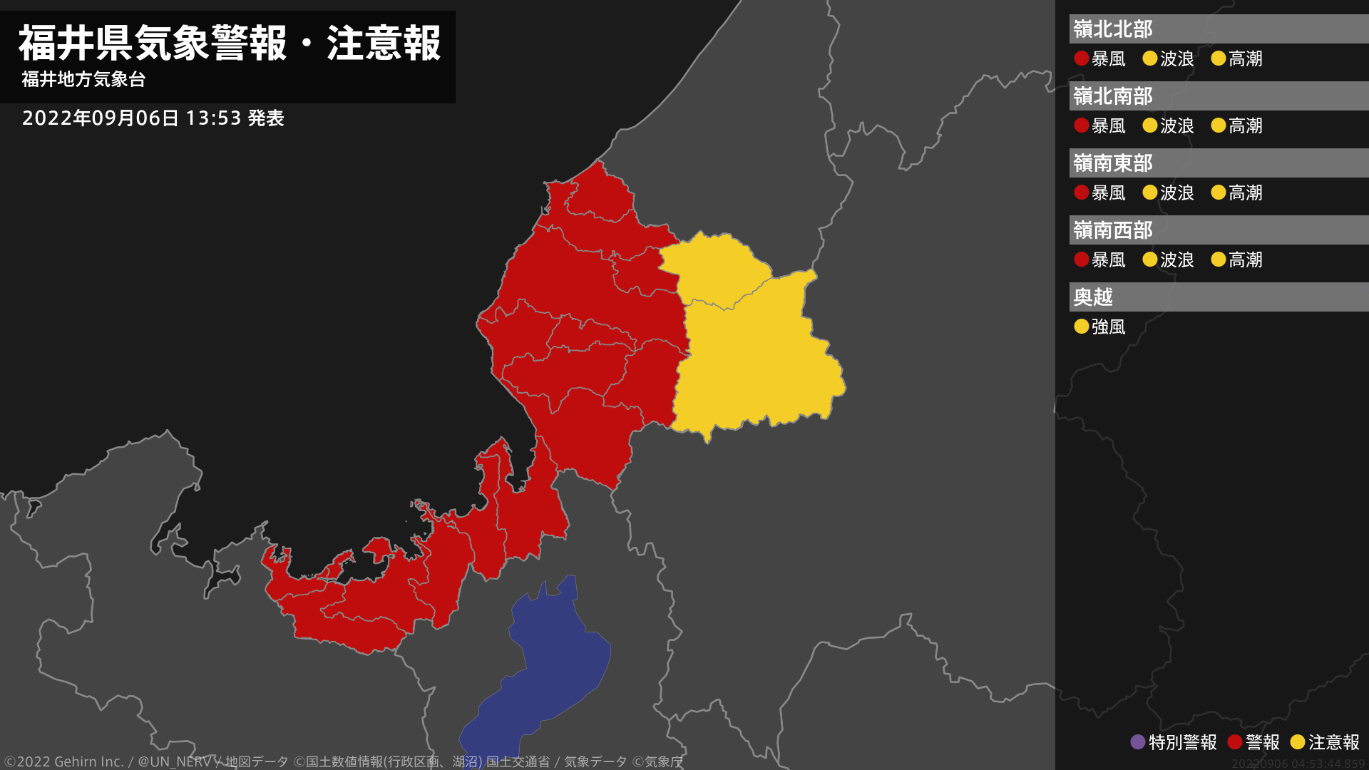 【福井県 気象警報 2022年09月06日 13:53】福井県では、6日夕方まで暴風に警戒してください。#気象警報 #気象警報注意報 #福井県