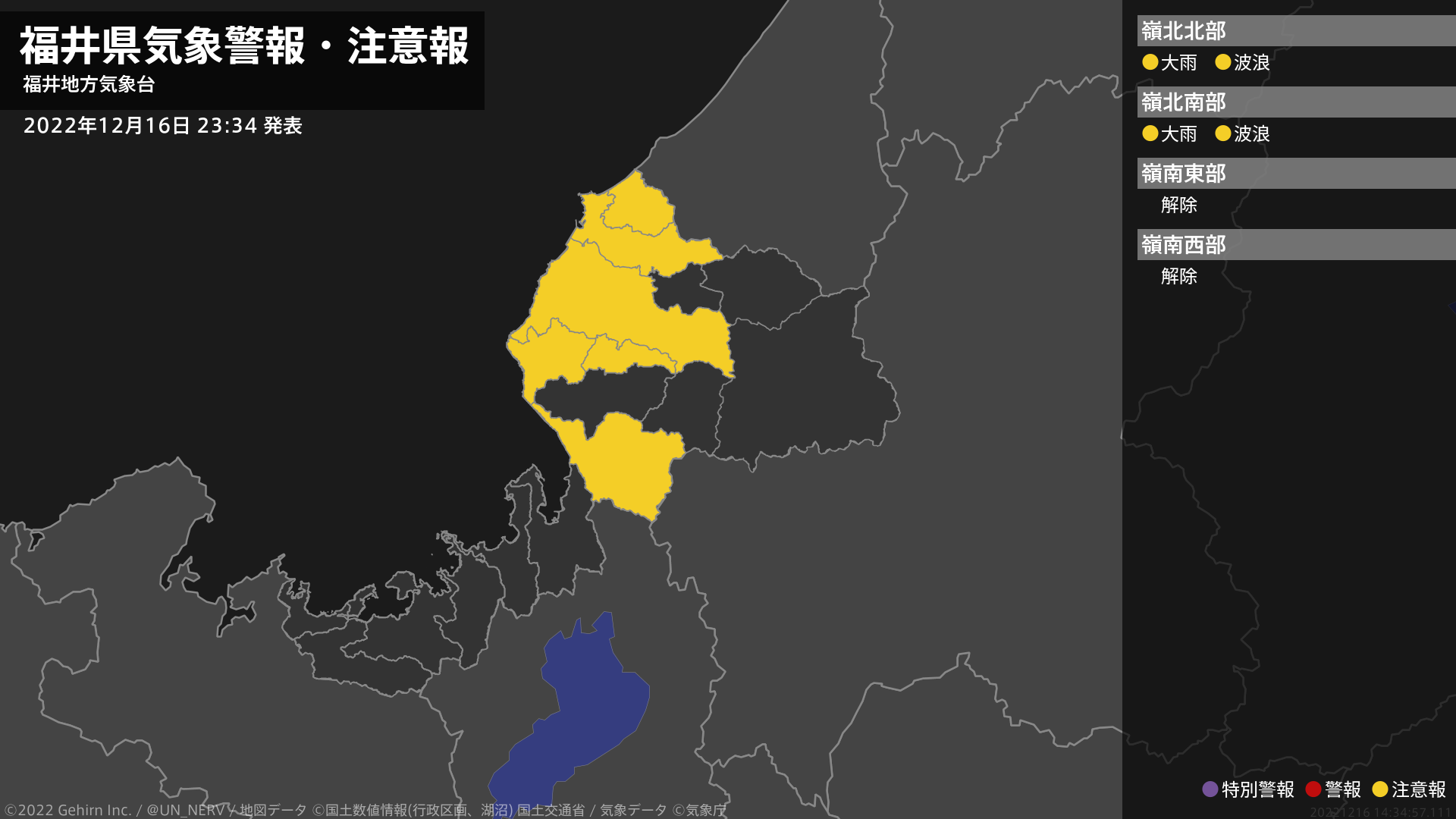 【福井県 気象警報・注意報 2022年12月16日 23:34】
