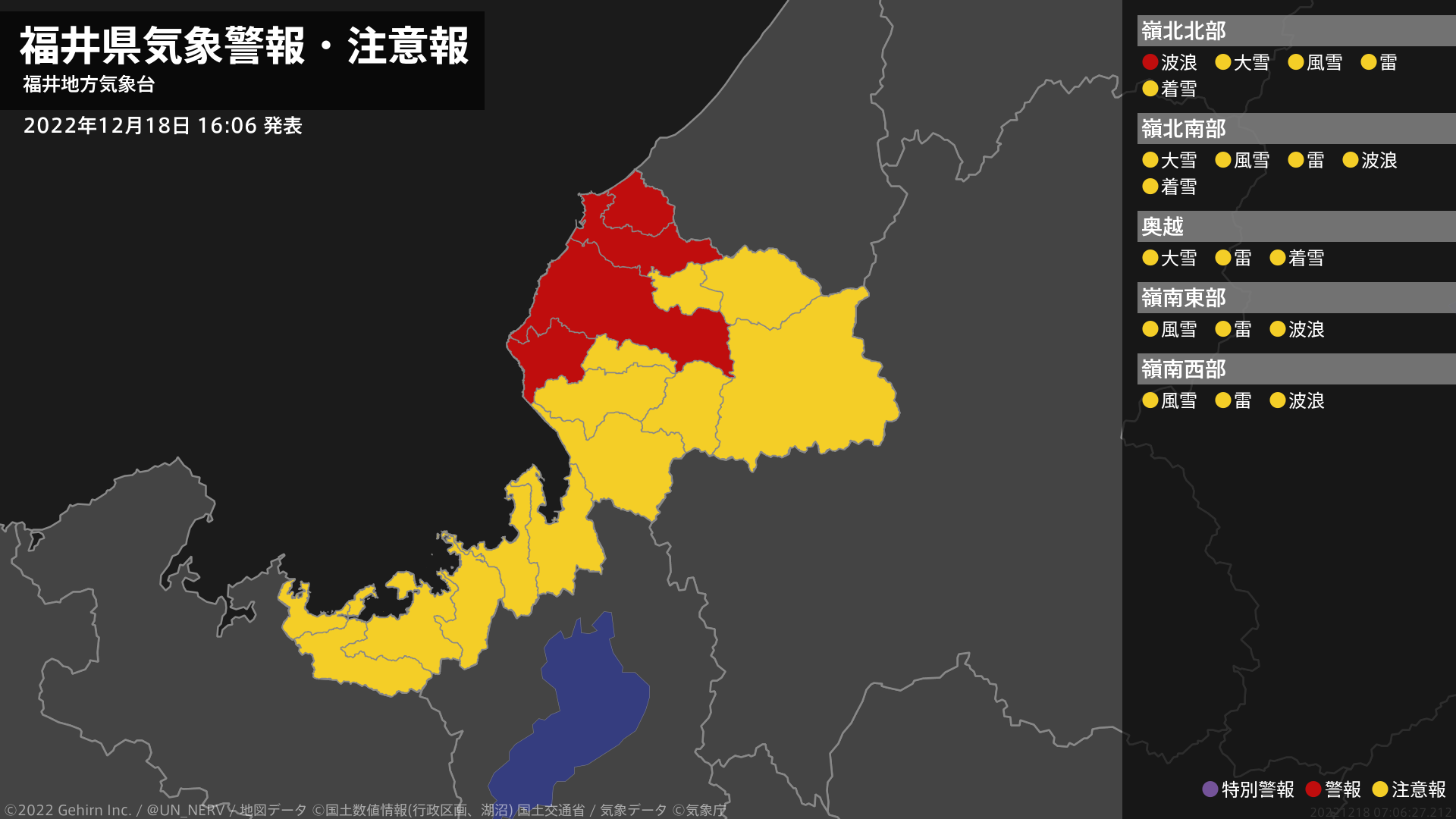 【福井県 気象警報・注意報 2022年12月18日 16:06】