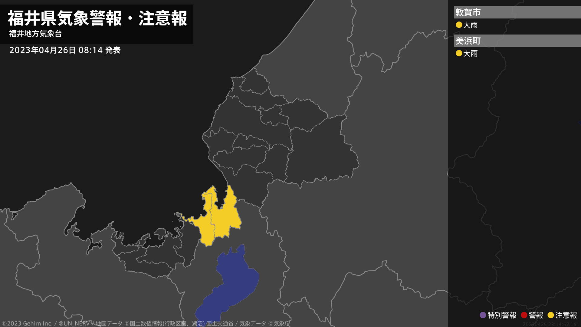 【福井県 気象警報・注意報 2023年04月26日 08:14】嶺南では、26日昼過ぎまで土砂災害に注意してください。#気象警報注意報 #福井県