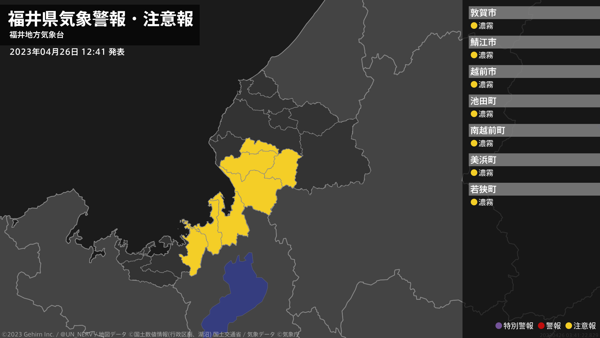 【福井県 気象警報・注意報 2023年04月26日 12:41】福井県では、26日夕方まで濃霧による視程障害に注意してください。#気象警報注意報 #福井県