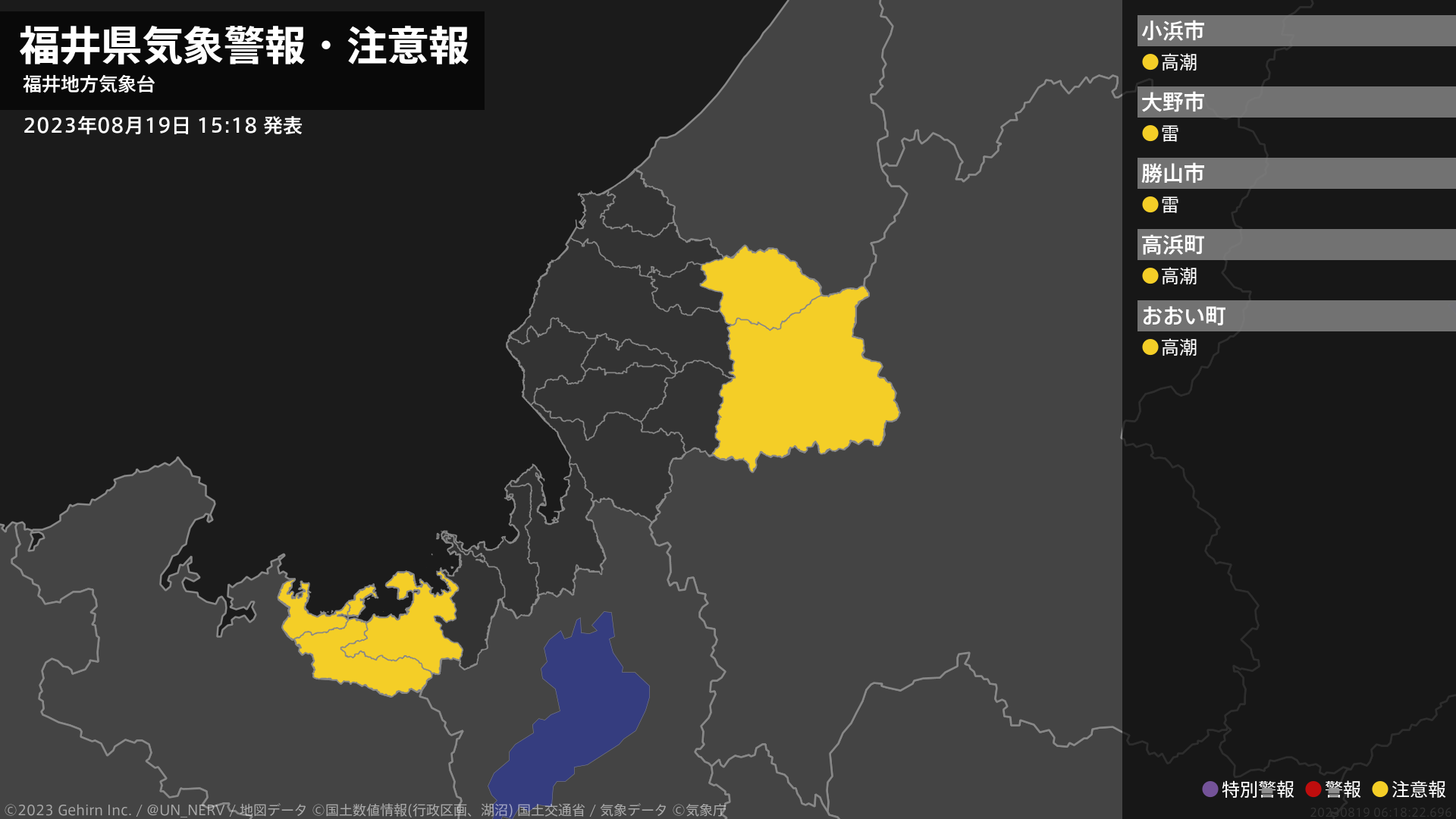 【福井県 気象警報・注意報 2023年08月19日 15:18】嶺南では、19日夕方まで高潮に注意してください。嶺北では、19日夜のはじめ頃まで急な強い雨や落雷に注意してください。#気象警報注意報 #福井県