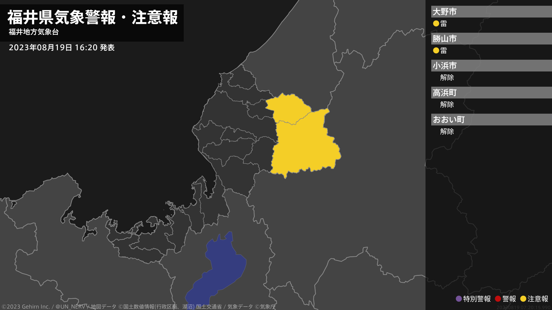【福井県 気象警報・注意報 2023年08月19日 20:43】注意報を解除します。#気象警報注意報 #福井県