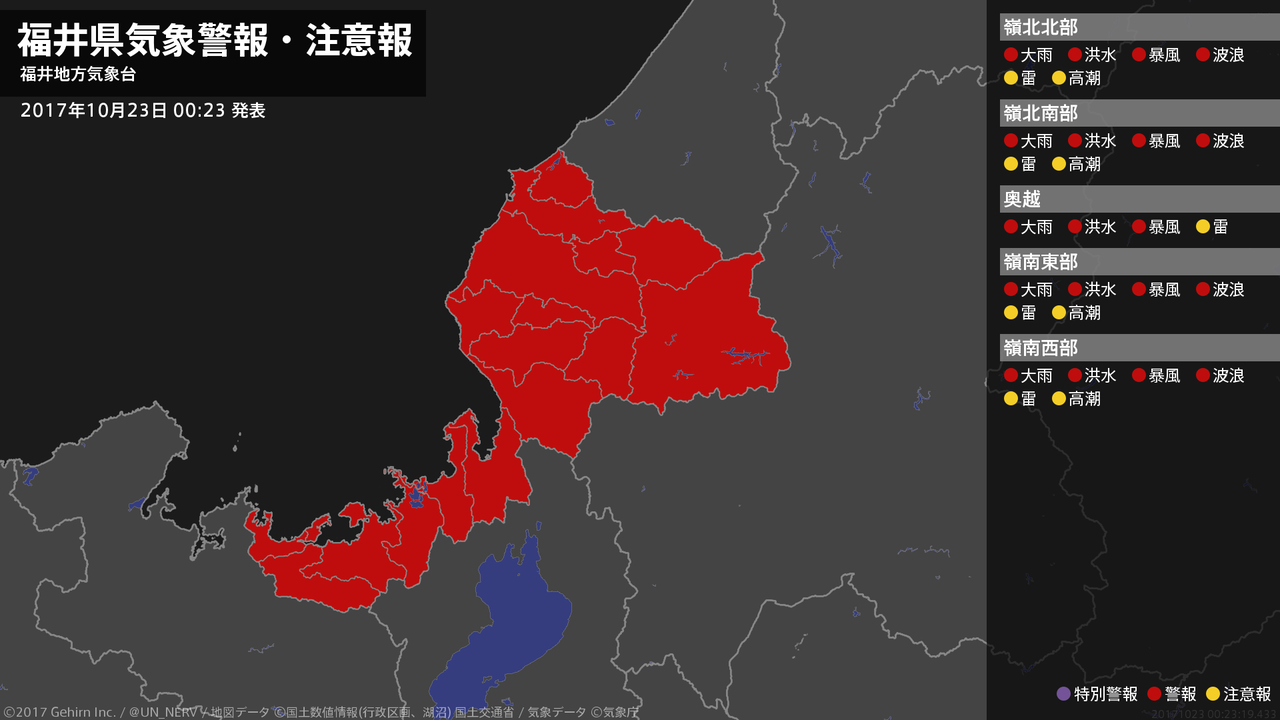 【福井県 気象警報・注意報 2017年10月23日 00:23】福井県では、23日夕方まで土砂災害に、23日明け方まで低い土地の浸水に、23日朝まで河川の増水や暴風に、23日夜遅くまで高波に警戒してください。#気象警報注意報 #福井県