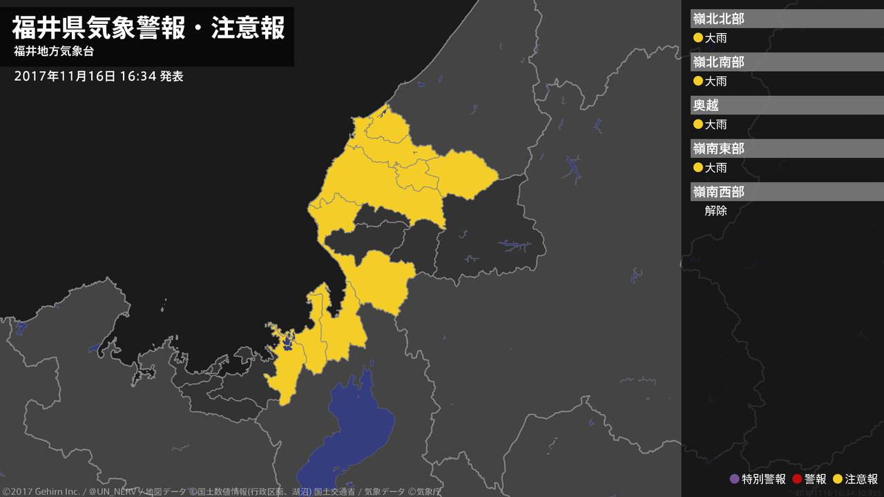 【福井県 気象警報・注意報 2017年11月16日 16:34】福井県では、16日夜遅くまで土砂災害に注意してください。#気象警報注意報 #福井県