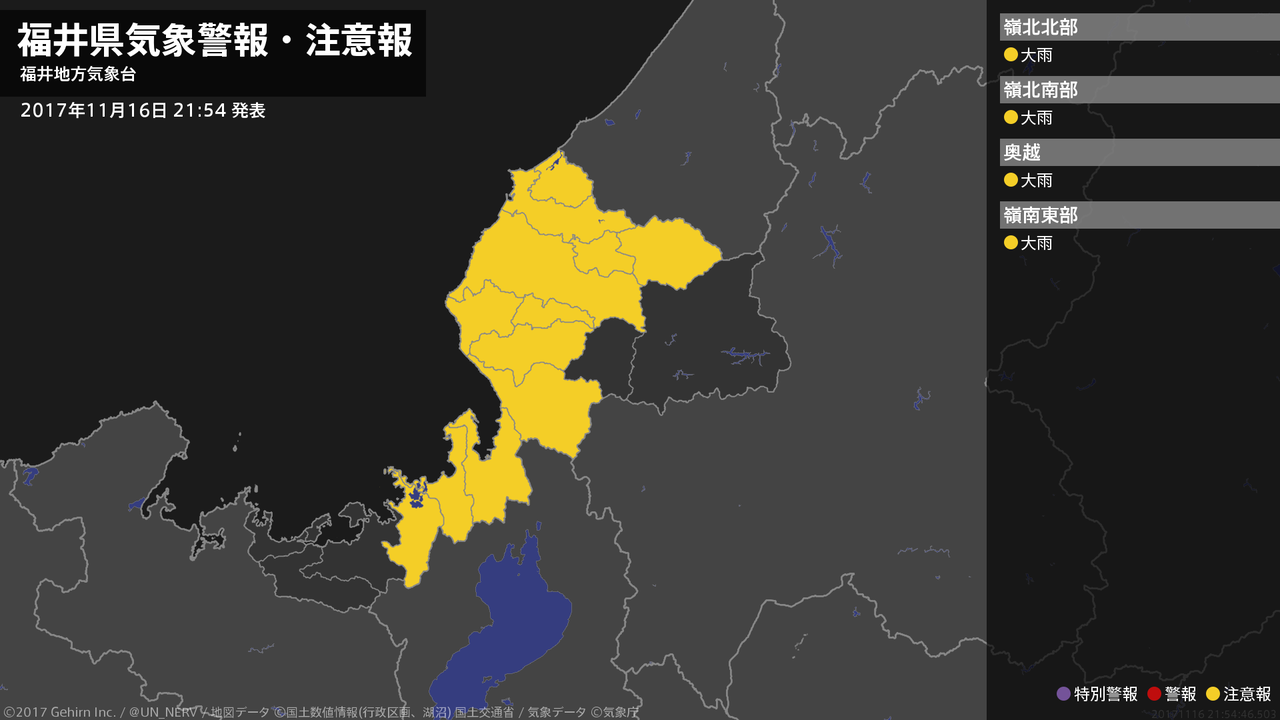 【福井県 気象警報・注意報 2017年11月16日 21:54】福井県では、17日明け方まで土砂災害に注意してください。#気象警報注意報 #福井県