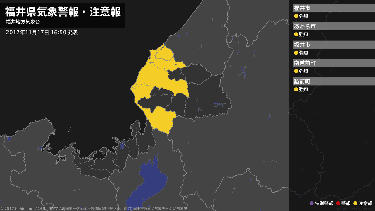 【福井県 気象警報・注意報 2017年11月17日 16:50】嶺北では、18日未明から強風に注意してください。#気象警報注意報 #福井県
