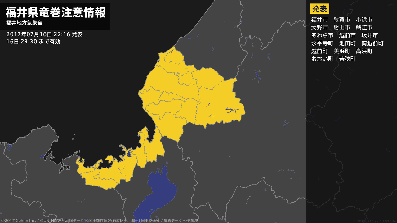 【福井県 気象警報・注意報 2017年07月16日 16:59】福井県では、16日夜遅くから17日明け方まで低い土地の浸水に、17日夕方まで竜巻などの激しい突風や落雷に注意してください。#気象警報注意報 #福井県