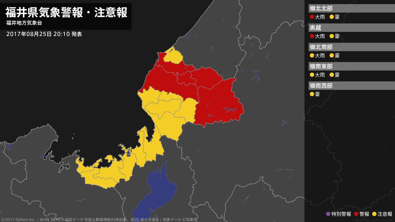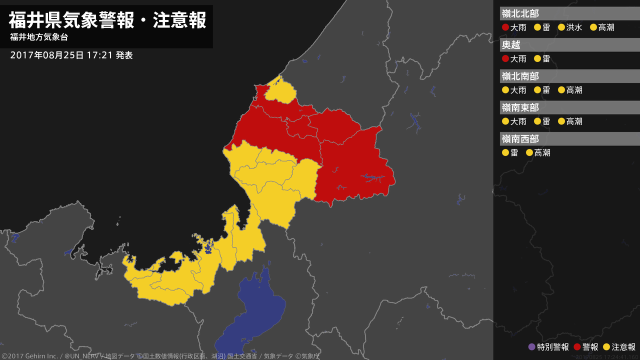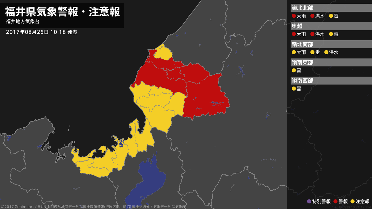 【福井県 気象警報 2017年08月25日 10:21】嶺北では、25日夕方まで土砂災害に、25日昼過ぎまで低い土地の浸水や河川の増水に警戒してください。#気象警報 #気象警報注意報 #福井県