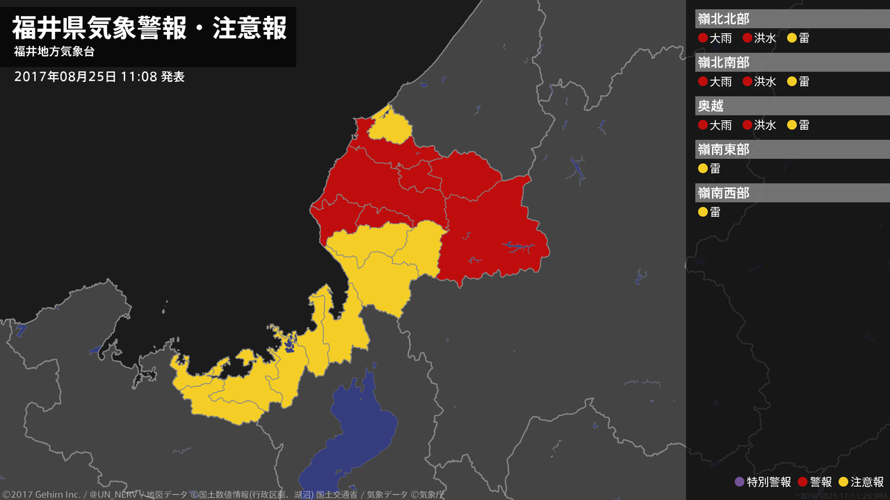 【福井県 気象警報 2017年08月25日 11:11】嶺北では、25日夕方まで土砂災害に、25日昼過ぎまで低い土地の浸水や河川の増水に警戒してください。#気象警報 #気象警報注意報 #福井県