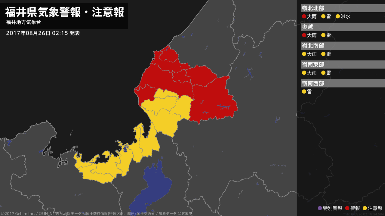 【福井県 気象警報・注意報 2017年08月26日 02:18】嶺北では、26日明け方まで土砂災害に警戒してください。#気象警報注意報 #福井県