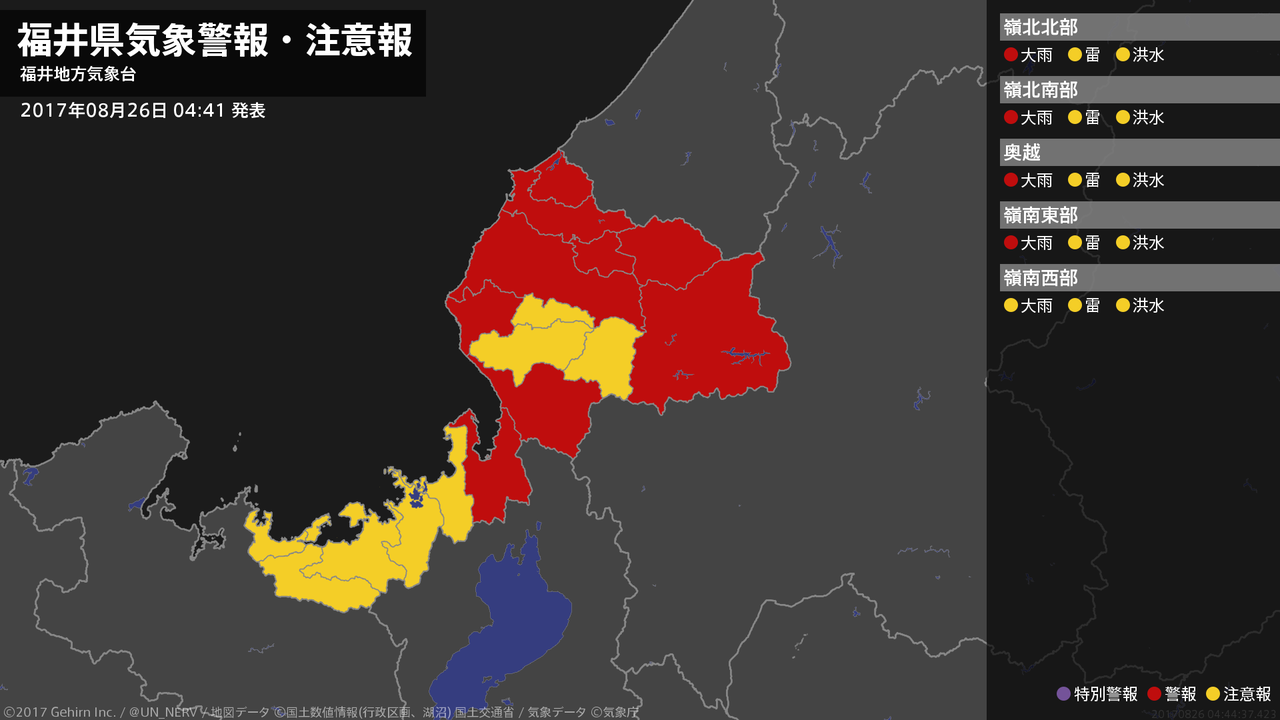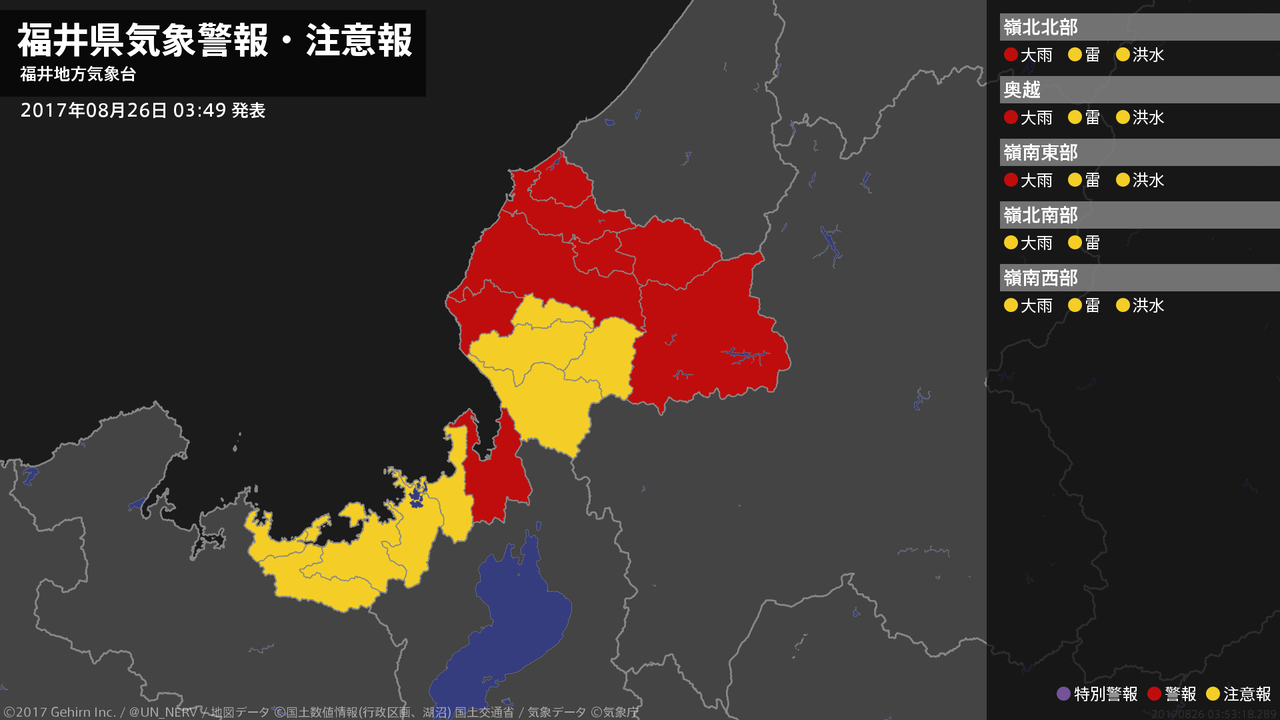【福井県 気象警報 2017年08月26日 03:53】嶺北では、26日明け方まで土砂災害に警戒してください。嶺南では、26日朝まで低い土地の浸水に警戒してください。#気象警報 #気象警報注意報 #福井県