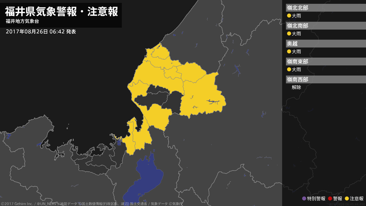 【福井県 気象警報(解除) 2017年08月26日 06:45】福井県に発表されていた気象警報はすべて解除されました。嶺南では26日朝まで、嶺北では26日昼前まで、土砂災害に注意してください。#気象警報 #福井県