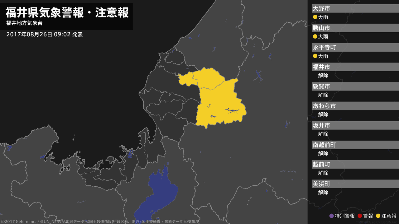 【福井県 気象警報・注意報 2017年08月26日 10:43】注意報を解除します。#気象警報注意報 #福井県