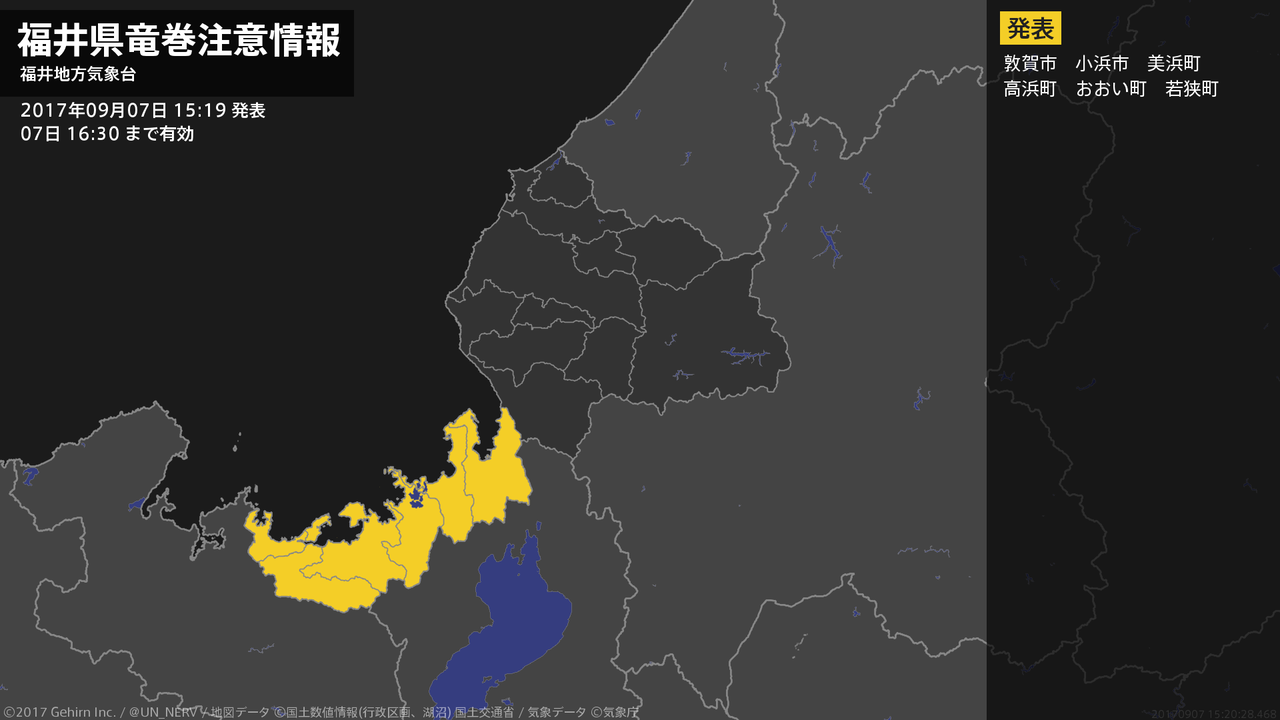 【福井県 竜巻注意情報】福井県は、竜巻などの激しい突風が発生しやすい気象状況になっています。頑丈な建物内に移動するなど安全確保に努めてください。この情報は07日16:30まで有効です。#竜巻注意情報 #福井県