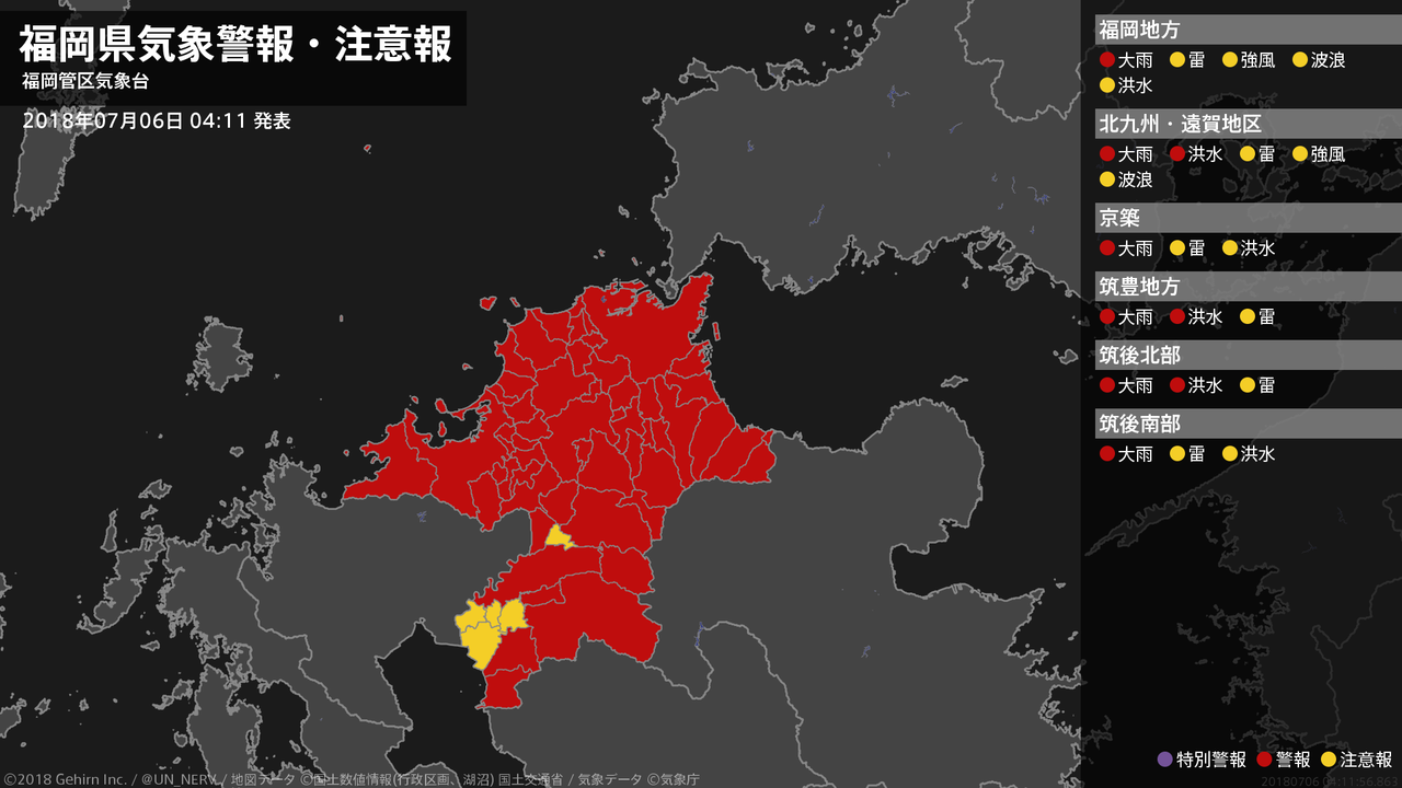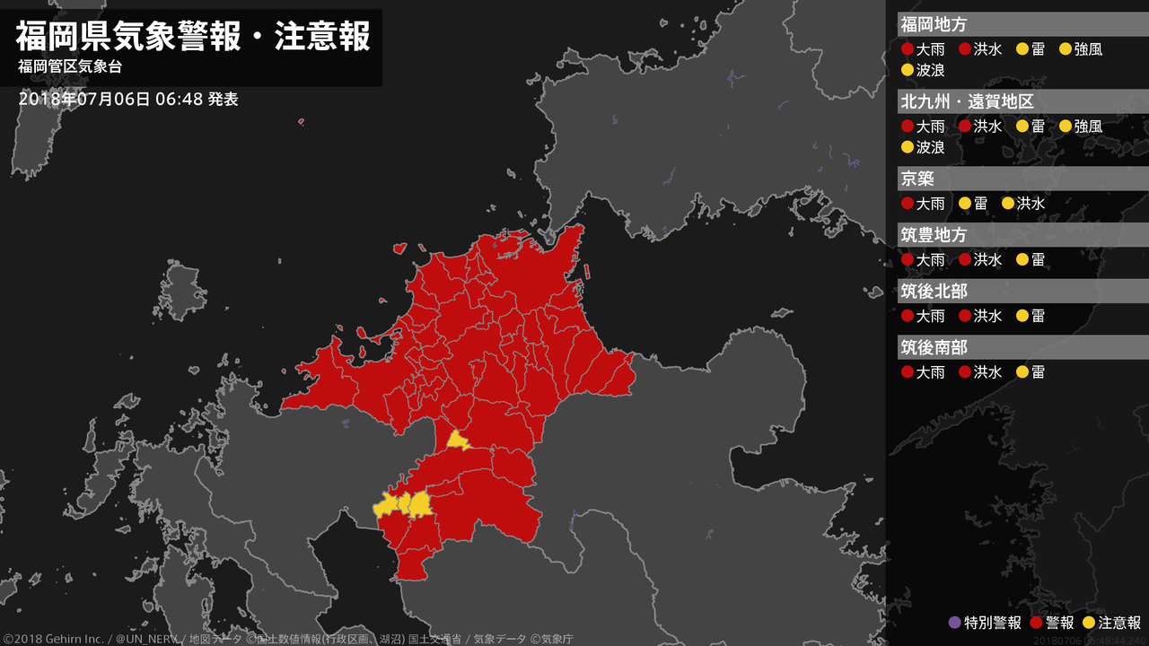 東日本から西日本では記録的な大雨となっている所があります。引き続き8日にかけて、雷を伴った猛烈な雨が断続的に降り、広い範囲で記録的な大雨となるおそれがあります。土砂災害、河川の増水や氾濫に厳重に警戒してください。また、低い土地の浸水に警戒し、落雷や竜巻などの激しい突風に注意してください。