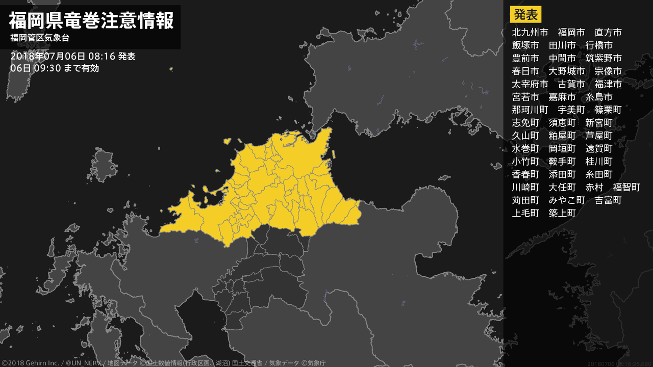 【福岡県 土砂災害警戒情報 2018年07月06日 11:50】福岡県の警戒対象地域では土砂災害の危険度が高まっています。身の安全を確保するよう努めてください。#土砂災害警戒情報 #福岡県
