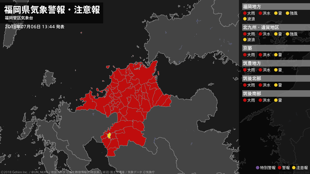 【福岡県 土砂災害警戒情報 2018年07月06日 13:00】福岡県の警戒対象地域では土砂災害の危険度が高まっています。身の安全を確保するよう努めてください。#土砂災害警戒情報 #福岡県