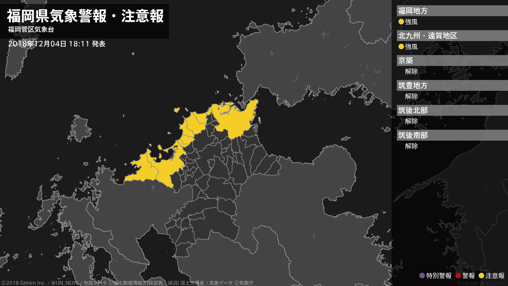 【福岡県 気象警報・注意報 2018年12月04日 18:11】福岡、北九州地方では、5日明け方まで強風に注意してください。#気象警報注意報 #福岡県