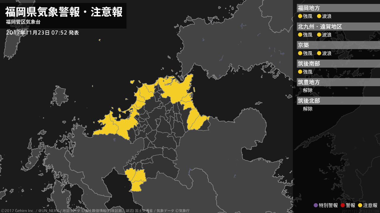 【福岡県 気象警報・注意報 2017年11月23日 03:15】福岡、北九州、筑後地方では、強風に注意してください。福岡、北九州地方では、高波に注意してください。福岡県では、濃霧による視程障害に注意してください。#気象警報注意報 #福岡県