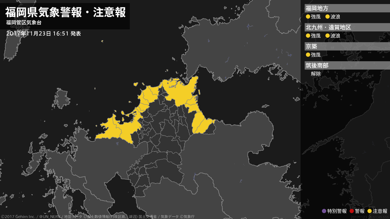 【福岡県 気象警報・注意報 2017年11月23日 16:51】福岡、北九州地方では、強風や高波に注意してください。#気象警報注意報 #福岡県