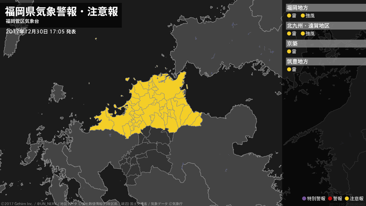 【福岡県 気象警報・注意報 2017年12月30日 17:06】福岡、北九州地方では、31日未明から強風に注意してください。福岡、北九州、筑豊地方では、31日明け方から31日朝まで落雷に注意してください。#気象警報注意報 #福岡県