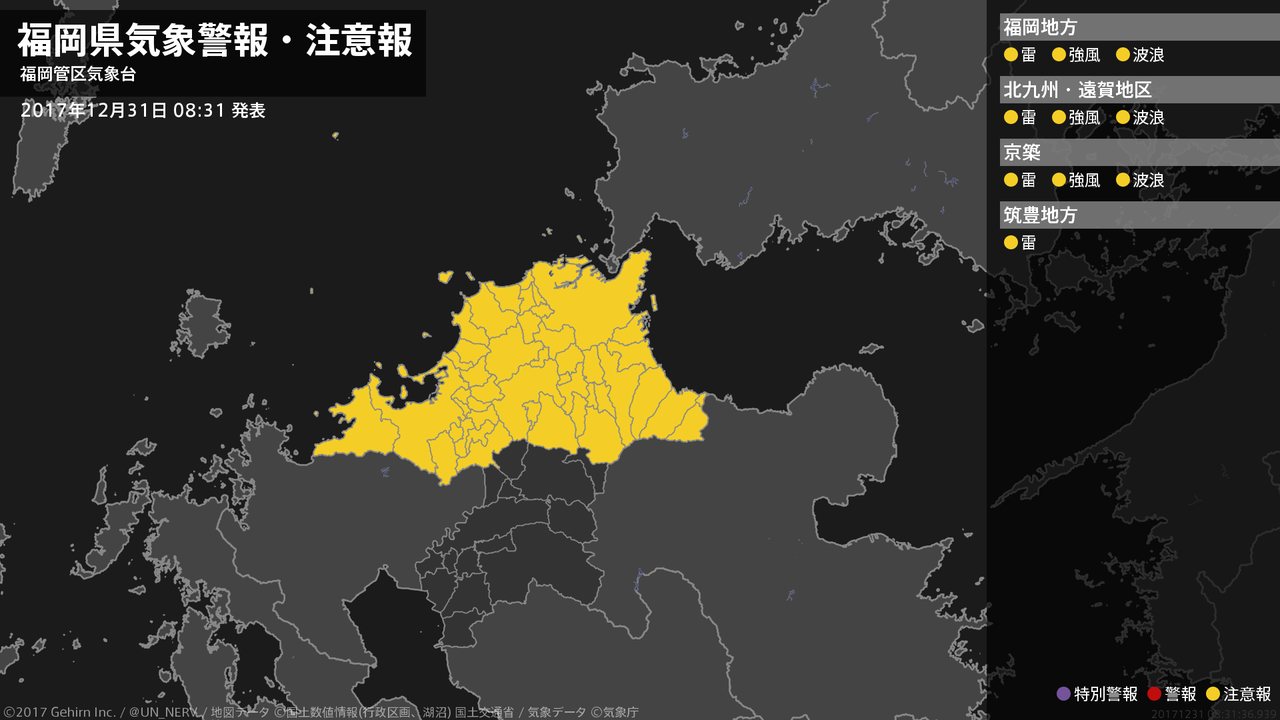【福岡県 気象警報・注意報 2017年12月31日 08:31】福岡、北九州地方では、強風や高波に注意してください。福岡、北九州、筑豊地方では、落雷に注意してください。#気象警報注意報 #福岡県