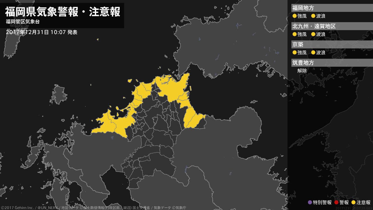 【福岡県 気象警報・注意報 2017年12月31日 10:07】福岡、北九州地方では、強風や高波に注意してください。#気象警報注意報 #福岡県
