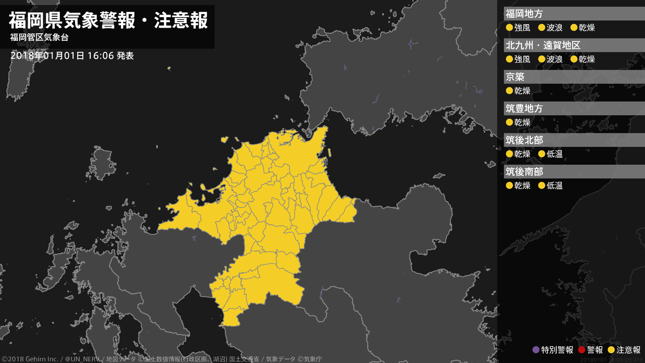 【福岡県 気象警報・注意報 2018年01月01日 16:06】福岡、北九州地方では、1日夜遅くまで強風や高波に注意してください。福岡県では、2日まで空気の乾燥による火の取り扱いに注意してください。筑後地方では、2日まで低温に注意してください。#気象警報注意報 #福岡県