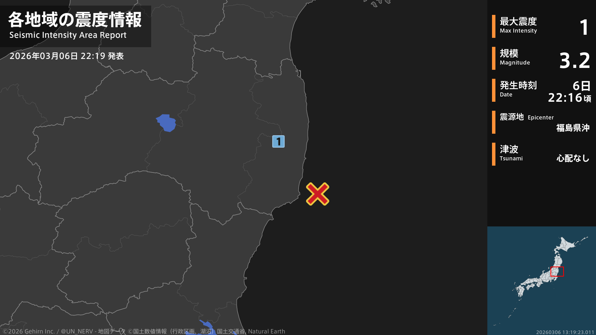 【地震情報 2026年3月6日】22時16分頃、福島県沖を震源とする地震がありました。震源の深さは約50km、地震の規模はM3.2、最大震度1を福島県で観測しています。この地震による津波の心配はありません。#地震 #福島県