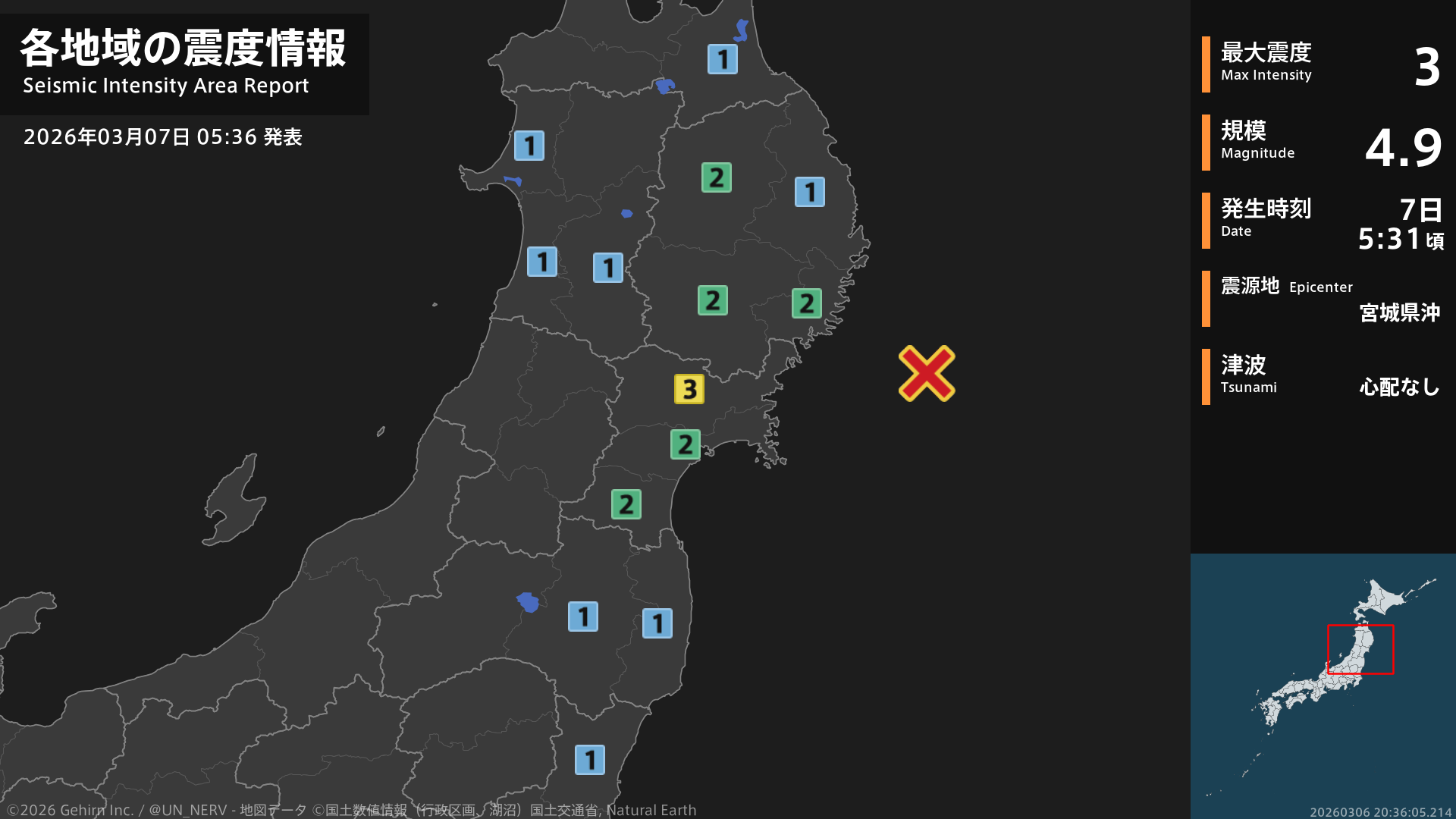 【地震情報 2026年3月7日】5時31分頃、宮城県沖を震源とする地震がありました。震源の深さは約50km、地震の規模はM4.9、最大震度3を宮城県で観測しています。この地震による津波の心配はありません。#地震 #宮城県 #岩手県 #青森県 #秋田県 #福島県 #茨城県