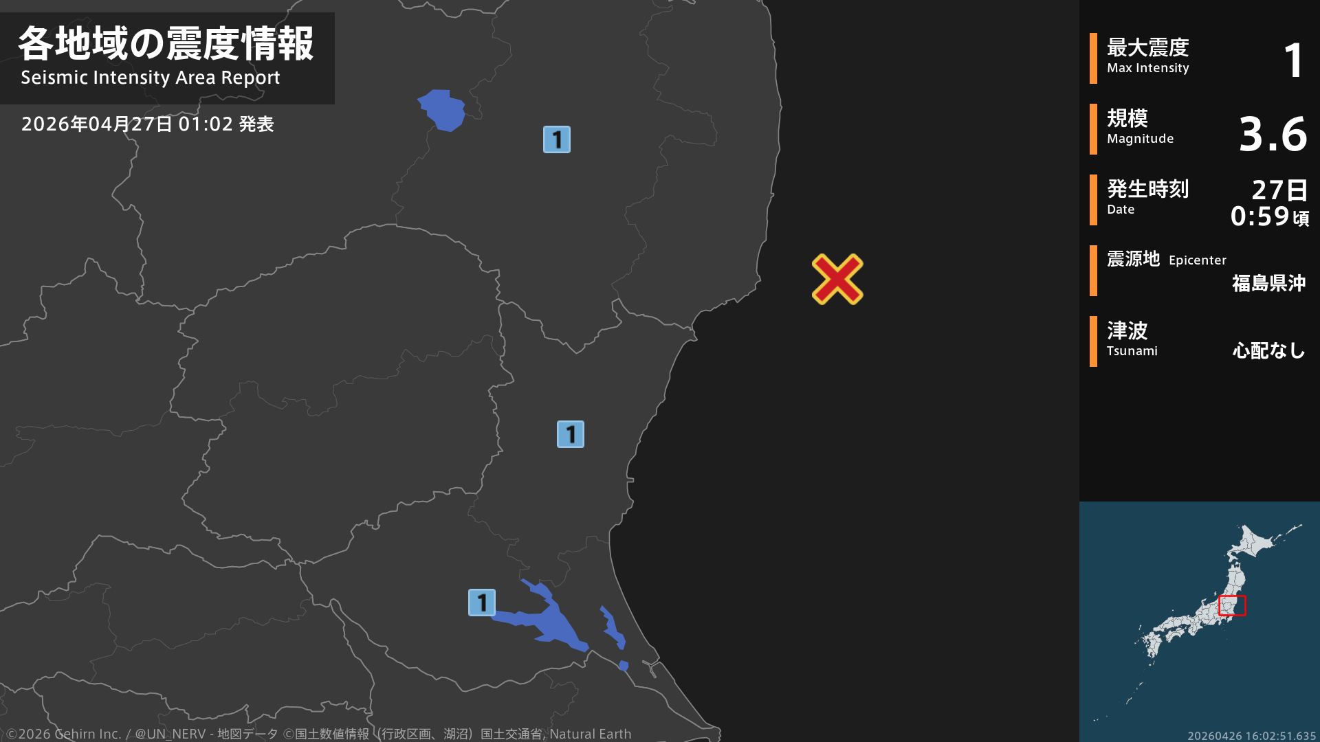 【地震情報 2026年4月27日】0時59分頃、福島県沖を震源とする地震がありました。震源の深さは約90km、地震の規模はM3.6、最大震度1を福島県、茨城県で観測しています。この地震による津波の心配はありません。#地震 #福島県 #茨城県
